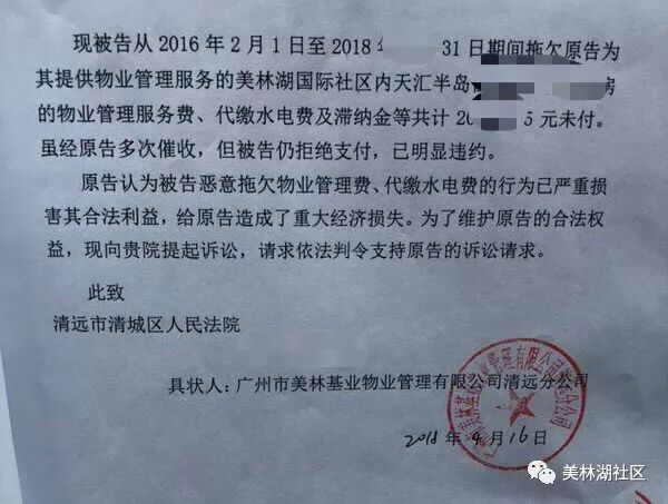 5,其他你们也想想吧,想想真的需要1.8元这个成本的物业管理费吗? 据我所知,美林湖存在很多业主拒缴物业费的情况,因为房屋质量拒缴,不收楼拒缴,服务不认可拒缴,费用过高拒缴等等,而美林物业没有做太多谈话沟通,具体的催缴方式有三宝,根据时间来递增: 没有物业收费明细,没有向业主解释的任何条文,公告,只有催款单、律师函、起诉书。